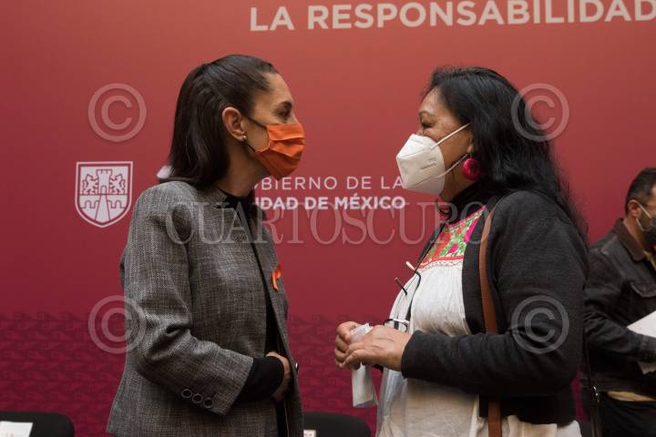 Claudia Sheinbaum, Jefa de Gobierno, conversa con Laura Martínez Rodríguez, directora de la Asociación para el Desarrollo Integral de Personas Violadas A.C. (ADIVAC), al finalizar la presentación de la campaña contra la violencia sexual "La Responsabilidad es Nuestra".