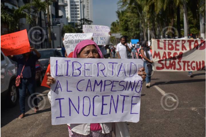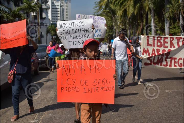 ACAPULCO, GUERRERO, 20ENERO2018.- Integrantes del Consejo de Ejidos y Comunidades Opositores a la Presa La Parota (Cecop) marcharon por la avenida Costera Miguel alemán, en la zona Dorada, para exigir la libertad de los policías comunitarios detenidos tras los hechos ocurridos el 7 de enero pasado en La Concepción, donde se registraron 11 muertos, cinco de ellos comunitarios, en dos enfrentamientos ocurridos. También se manifestaron en contra de la Ley de seguridad interior. Un centenar de pobladores de Cacahuatepec y miembros del Cecop fueron respaldados en la marcha por profesores de la Coordinadora Estatal de Trabajadores de la Educación en Guerrero. FOTO: ESPECIAL /CUARTOSCURO.COM