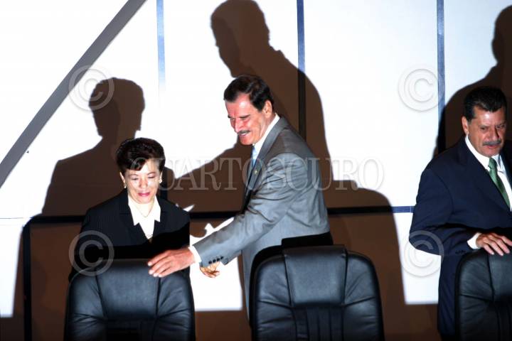 MEXDF 14JUNIO2004.- María Marván Laborde, comisionada del IFAI saludo al presidente Vicente Fox, durante la ceremonia de inauguración de la Semana Nacional de Transparencia 2004, que se desarrolla en el Meseo de Antropologia. FOTO: Juan Pablo Zamora/CUARTOSCURO.COM