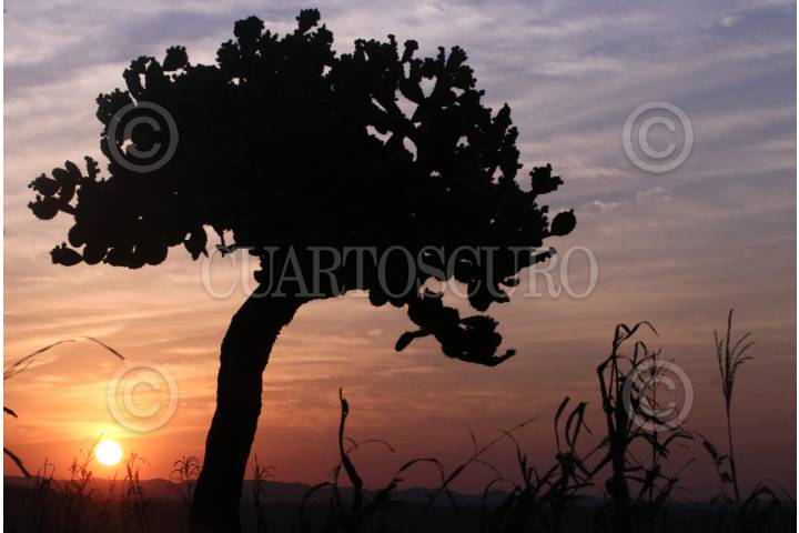 El sol emerge en el horizonte, al frente, a contraluz, un nopal silvestre. Imagen tomada en los campos de labranza del pueblo de Tecajec, en Yecapixtla, Morelos.