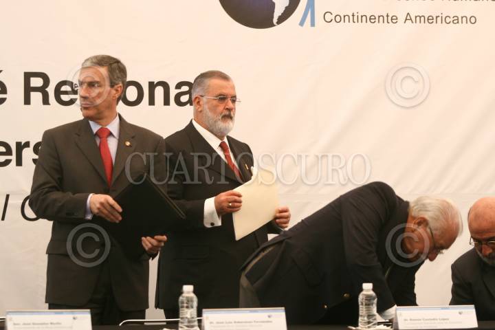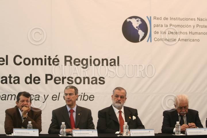 MÉXICO, D.F., 26MAYO2008.-Omar Cabezas Lacayo Presidente de la Federación Iberoamericana de Ombusman, José González Morfín Vicepresidente de la Mesa Directiva del Senado de la República , José Luis Soberanes, Ramón Custodio Comisionado Nacional para los Derechos Humanos en Honduras, durante la reunión de trabajo contra la trata de personas México, Centroamérica y el Caribe. FOTO:SÁSHENKA GUTIÉRREZ/CUARTOSCURO.COM