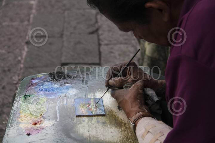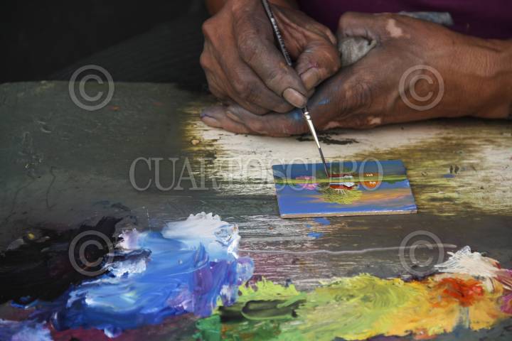 MÉXICO, D.F., 19AGOSTO2015.- Un artista realiza un paisaje en miniatura, un oleo sobre madera. FOTO: ISABEL MATEOS /CUARTOSCURO.COM
