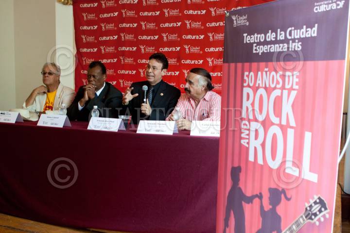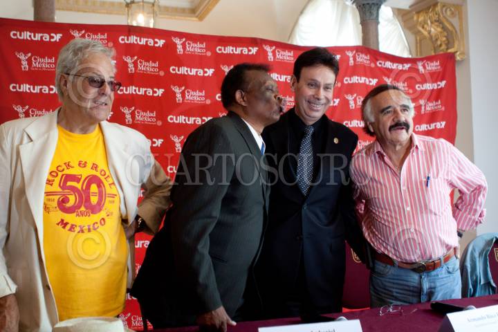 MÉXICO, D.F., 25MAYO2011.- Eduardo "Lalo" Carrión, integrante de los Hermanos Carrión, Johny Laboriel, cantante rockanrolero, Armando Báez Pinal, secretario general Sindicato Único de Trabajadores de la Música, y Armando Martínez, baterista fundador Teen Tops, ofrecieron una conferencia prensa para hablar sobre el concierto en el que cual festejarán los 50 años del rock en México en el teatro de la Ciudad Esperanza Iris. FOTO: MOISÉS PABLO/CUARTOSCURO.COM