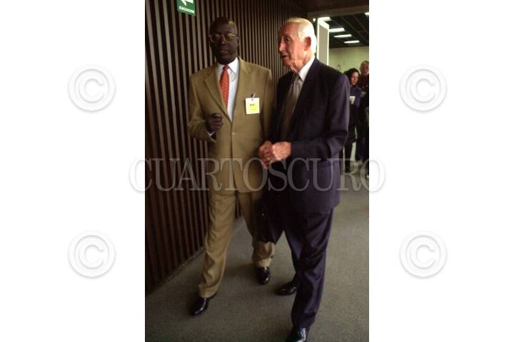 México D.F 20FEB2004.- Francis Deng, representante del secretario general de las Naciones Unidas conversa con Luis H. Alvarez, presidente de la COCOPA al término de la Clausura del Foro Internacional de Personas Desplazadas que organizo la SRE. FOTO: Eunice Adorno/CUARTOSCURO.COM