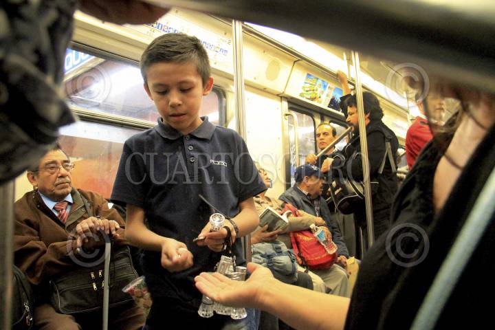 CIUDAD DE MÉXICO, 02AGOSTO2016.- Un niño vende lámparas en el metro realizando su recorrido por los vagones. FOTO: MARCELO PALACIOS /CUARTOSCURO.COM