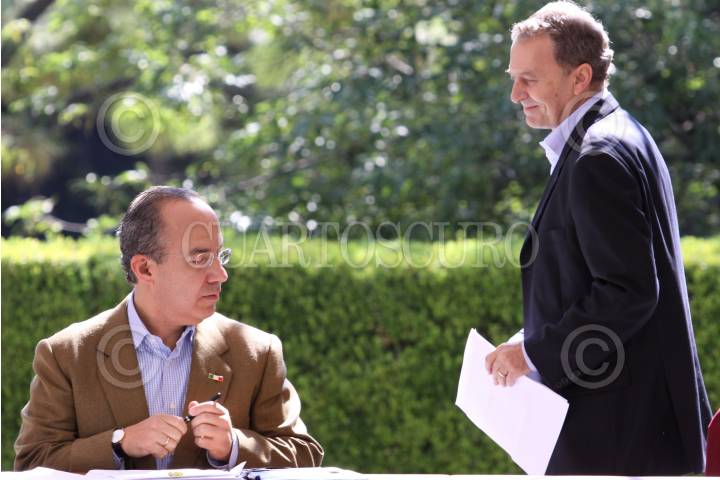MÉXICO, D.F., 16MAYO2009.- Felipe Calderón Hinojosa, Presidente de México y Philippe Lamy, representante de la OMS, durante la ceremonia "Contribución de México a la Organización Mundial de la Salud para la Producción de la Vacuna del Virus AH1N1, en la explanada del monumento a Francisco I. Madero en Los Pinos. FOTO: MOISÉS PABLO/CUARTOSCURO.COM