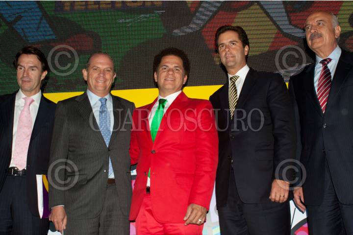 MÉXICO, D.F., 08NOVIEMBRE2010.- Fernando Landeros, presidente de Fundación Teletón, Javier Sordo Madaleno, arquitecto, Romero Britto, artista plástico, Javier Arruguinaga, director general de Banamex y José Luis Barraza, director general de Aeromexico, durante el anuncio del lanzamiento del proyecto "Romero BrittoTeletón 2010", donde el artista plástico crea la imagen para el Teletón 2010 que se realizará el próximo 3 y 4 de diciembre. FOTO: MISAEL VALTIERRA/CUARTOSCURO.COM