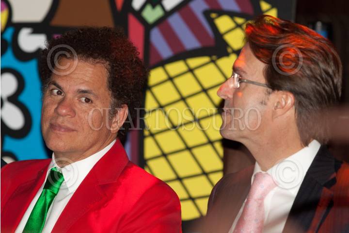 MÉXICO, D.F., 08NOVIEMBRE2010.- Romero Britto, artista plástico brasileño y Fernando Landeros, presidente de Fundación Teletón, durante el anuncio del lanzamiento del proyecto "Romero BrittoTeletón 2010", donde el artista plástico crea la imagen para el Teletón 2010 que se realizará el próximo 3 y 4 de diciembre. FOTO: MISAEL VALTIERRA/CUARTOSCURO.COM