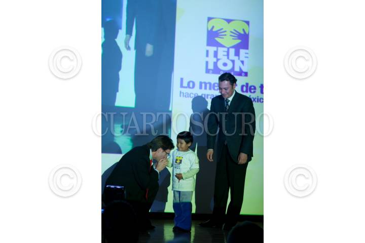 MÉXICO, D.F., 25NOVIEMBRE2010.- Fernando Landeros, presidente de la Fundación Teletón, posa para los fotógrafos besándole la mano a una niña mientras Mariano Osorio, locutor, observa la acción durante el acto en el que Fundación Teletón donó aparatos para dar radiaciones a los niños con cáncer del Instituto Nacional de Pediatría. FOTO: IVÁN STEPHENS/CUARTOSCURO.COM