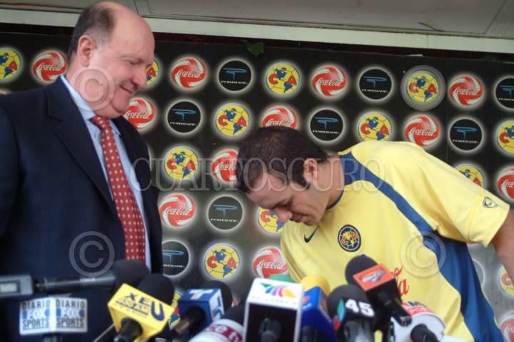 MEXICO, D.F. 13DICIEMBRE2004.- Cuauhtemoc Blanco regresó al equipo América y el presidente del equipo, Manuel Lapuente, realizó la presentación a los medios FOTO: Iván Stephens/CUARTOSCURO.COM