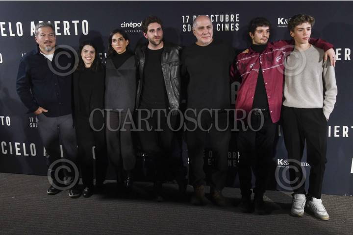 CIUDAD DE MÉXICO, 09OCTUBRE2024.- Guillermo Arriaga, escritor, junto a sus hijos Mariana y Santiago, ambos directores, los actores: Julio Cesar Cedillo, Theo Goldín y Maximo Hollander, y Eréndira Núñez Larios, productora, durante la conferencia de prensa para la presentación del largometraje "A cielo abierto", realizada en Cinépolis Miyana. La película llegará a las salas del país el próximo 17 de octubre. FOTO: MARIO JASSO/CUARTOSCURO.COM