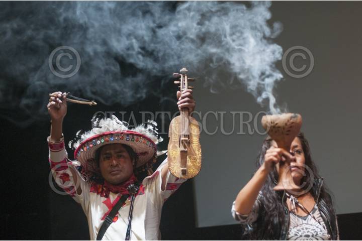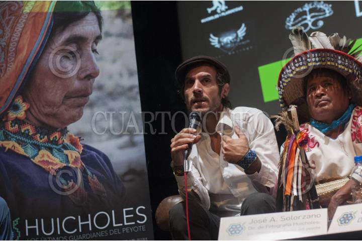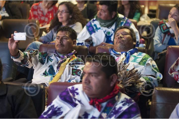 MÉXICO, D.F., 07MAYO2014.- Presentación del largometraje documental independiente "Huicholes: los últimos guardianes del peyote", una historia acerca del Pueblo Wixárika (huichol), cultura originaria del oeste central de México en la Sierra Madre Occidental y su lucha contra corporaciones transnacionales mineras por preservar Wirikuta, su territorio más sagrado, tierra donde crece el peyote. Durante el evento asistieron algunos huicholes protagonistas de la película. FOTO: DIEGO SIMÓN SÁNCHEZ /CUARTOSCURO.COM