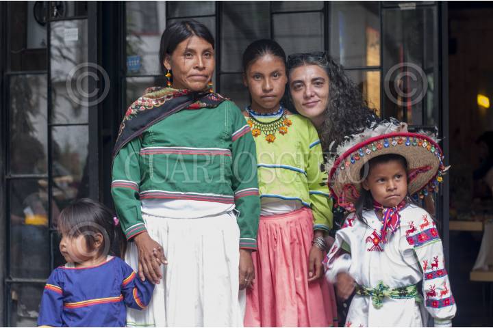 MÉXICO, D.F., 07MAYO2014.- Familia de la comunidad Wixárika y la productora Paola Stefani, durante la presentación del largometraje documental independiente "Huicholes: los últimos guardianes del peyote", una historia acerca del Pueblo Wixárika (huichol), cultura originaria del oeste central de México en la Sierra Madre Occidental y su lucha contra corporaciones transnacionales mineras por preservar Wirikuta, su territorio más sagrado, tierra donde crece el peyote. Durante el evento asistieron algunos huicholes protagonistas de la película. FOTO: DIEGO SIMÓN SÁNCHEZ /CUARTOSCURO.COM