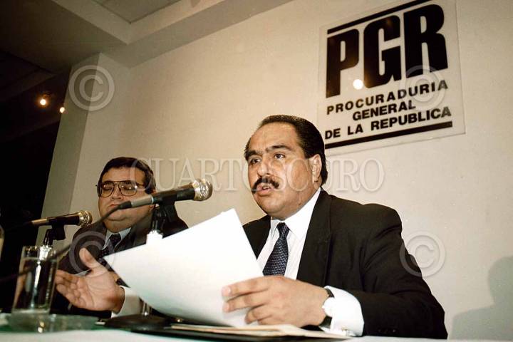 José Trinidad Larrieta de la PGR y Rafael Maceda de la Concha procurador militar anunciaron la detencion de los generales Mario Acosta Chaparro y Francisco Quiroz Hermosillo por el cargo de delitos contra la salud y participar y colaborar al cartel de Amado Carrillo, FOTO: Eduardo Loza/CUARTOSCURO.COM