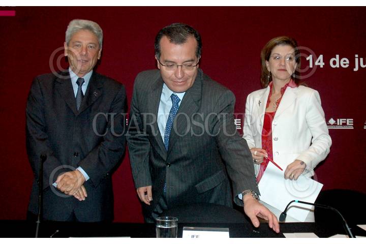 MÉXICO, D.F.30AGOSTO2007.- Luis Carlos Ugalde, consejero presidente del Instituto Federal Electoral durante la sesión extraordinaria en dicha institución. En la imagen con los consejeros Arturo Sánchez y Alejandra Latapí. FOTO: PAOLA HIDALGO/CUARTOSCURO.COM