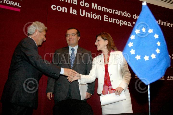 MÉXICO, D.F. 14JUNIO2006.- El embajador Mendel Goldstein, jefe de la Delegación de la Comisión Europea, Luis Carlos Ugalde, consejero presidente del Instituto Federal Electoral (IFE) y Alejandra Latapí, consejera electoral y presidenta de la Comisión de Relaciones Institucionales e Internacionales del IFE, firmaron el memorando de acuerdo entre el IFE y la Unión Europea concerniente a la participación de una misión de la Unión Europea para presenciar las elecciones presidenciales y legislativas del 2 de julio de 2006. FOTO: Iván Stephens/CUARTOSCURO.COM