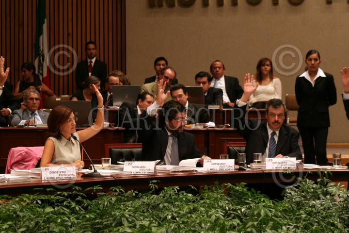 MÉXICO, D.F. 18ABRIL2007.- Los consejeros Alejandra Latapí, Marco Antonio Gómez y Andrés Albo Márquez durante una votación en la sesión extraordinaria del Instituto Federal Electoral. FOTO: PAOLA HIDALGO/CUARTOSCURO.COM