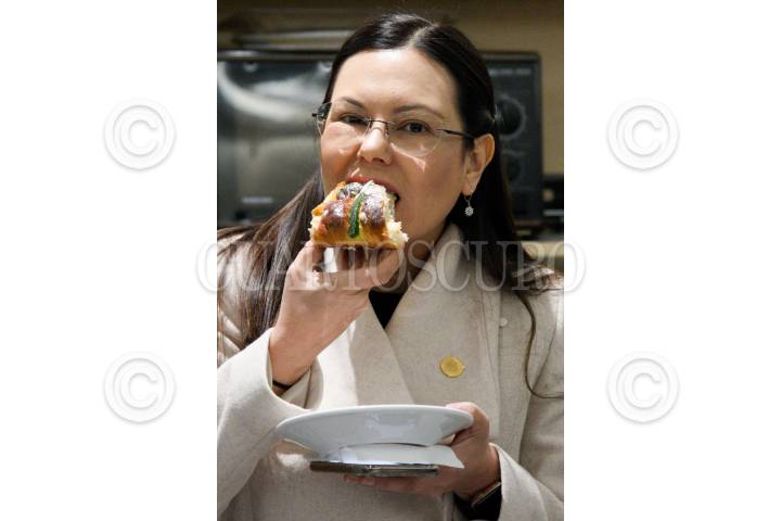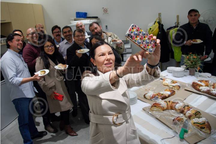 Laura Angélica Rojas, diputada del PAN y presidenta de la mesa directiva, partió la tradicional Rosca de Reyes.