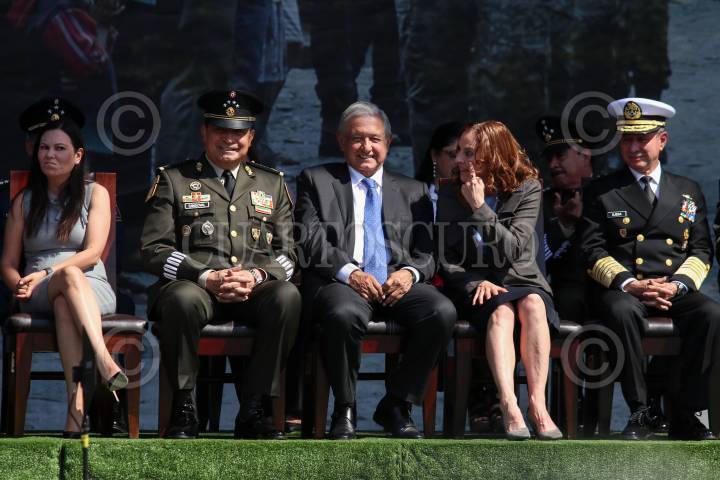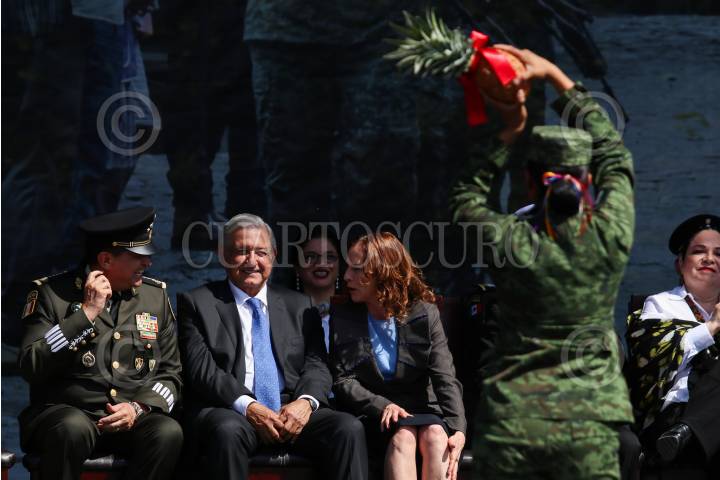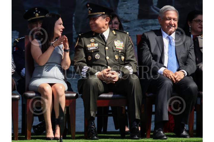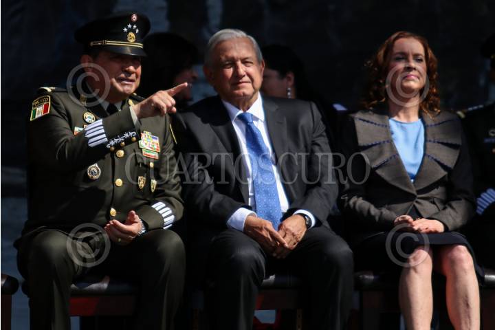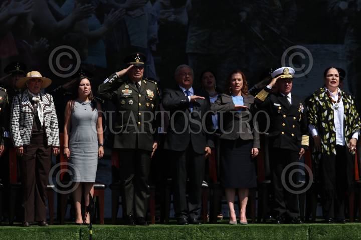 Olga Sánchez Cordero, secretaria de Gobernación; Laura Ángelica Rojas, presidenta de la Cámara de Diputados; Luis Cresencio Sandoval, secretario de la Defensa Nacional; Andrés Manuel López Obrador, presidente de México; Beatríz Gutiérrez Müller,