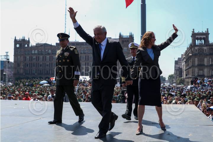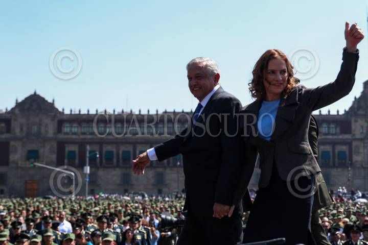 Andrés Manuel López Obrador, presidente de México, y Beatríz Gutiérrez Müller, investigadora y primera dama, durante el 107 aniversario del Día del Ejército Mexicano.