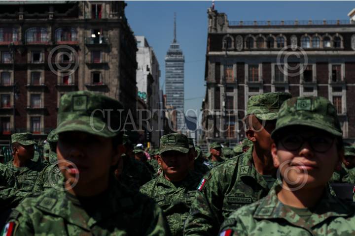 Soldados en la plancha del Zócalo durante el 107 aniversario del Ejército Mexicano.