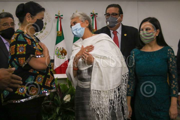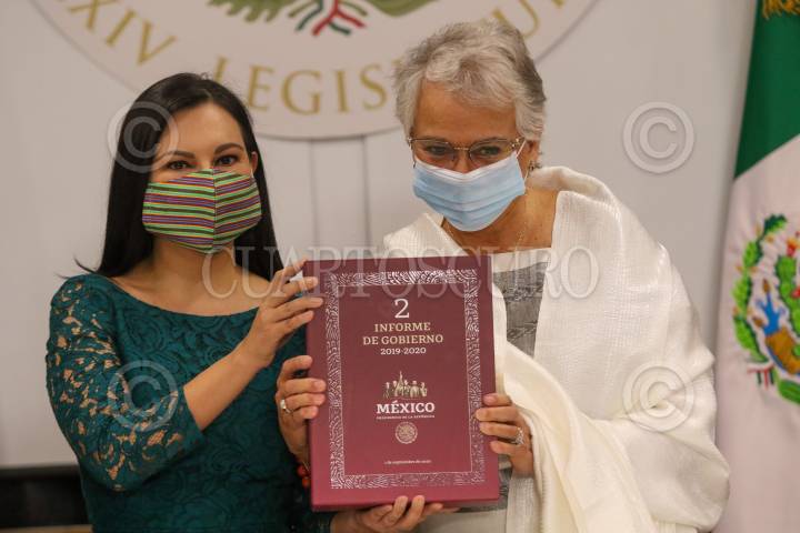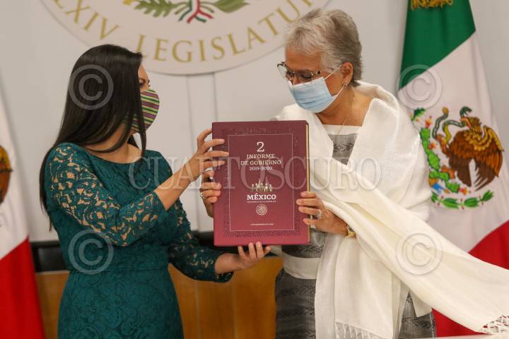 Laura Angélica Rojas, presidenta de la Cámara de Diputados, recibe el Segundo Informe de Gobierno de manos de Olga Sánchez Cordero, secretaria de Gobernación.