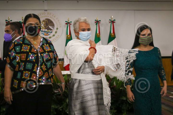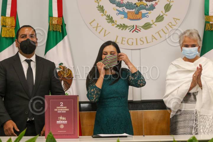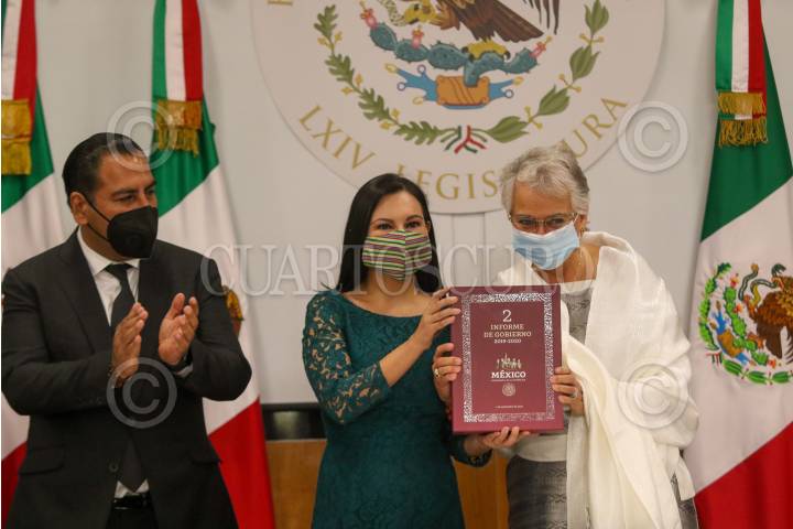 Eduardo Ramírez, presidente del Senado; Laura Angélica Rojas, presidenta de la Cámara de Diputados, y Olga Sánchez Cordero, secretaria de Gobernación, muestran el Segundo Informe de Gobierno del Presidente Andrés Manuel López Obrador.