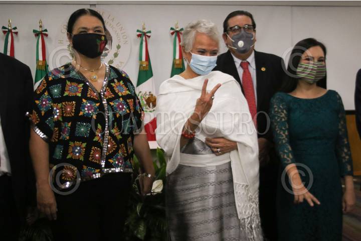 Dulce María Sauri, vicepresidenta de la Cámara de Diputados; Olga Sánchez Cordero, secretaria de Gobernación, y Laura Angélica Rojas, presidenta de la Cámara de Senadores, al finalizar el protocolo del Segundo Informe de Gobierno del Presidente Andrés Manuel López Obrador.