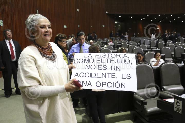 MÉXICO, D.F., 01DICIEMBRE2015.- Laura Esquivel muestra una pancarta durante la sesión ordinaria en el congreso de la unión. FOTO: SAÚL LÓPEZ /CUARTOSCURO.COM
