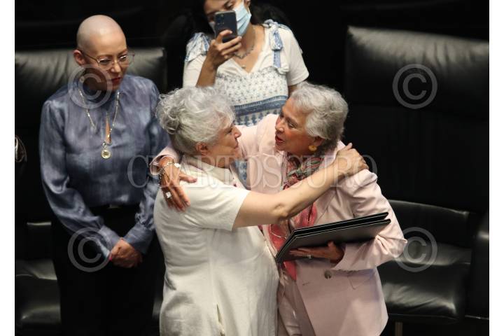 Olga Sánchez Cordero y Laura Esquivel durante su nombramiento como embajadora de México en Brasil.