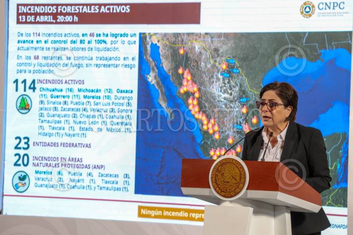 CIUDAD DE MÉXICO, 14ABRIL2025.- Laura Velázquez Alzúa, directora nacional de Protección Civil, informo sobre el estado de los incendios forestales en el país, señalando que en Morelos y Oaxaca están los más grandes, aunque estos no amenazan vidas humanas. FOTO: MOISÉS PABLO/CUARTOSCURO.COM