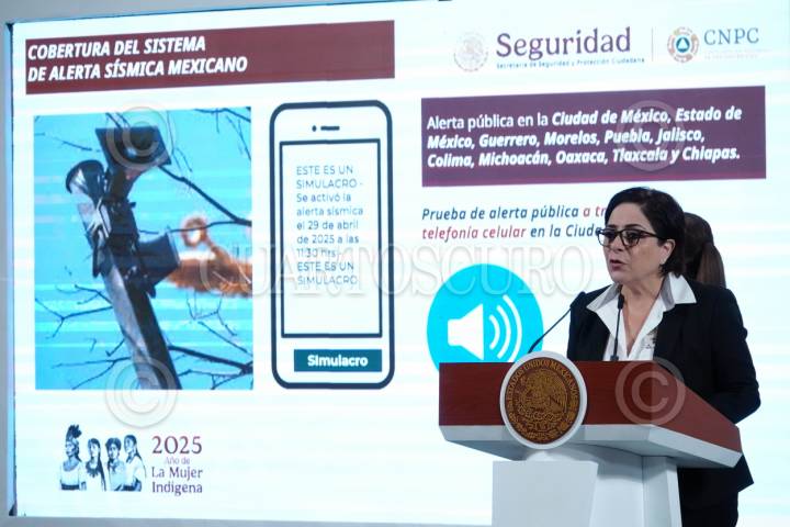 CIUDAD DE MÉXICO, 25ABRIL2025.- Laura Velázquez Alzua, coordinadora nacional de Protección Civil, informó sobre las medidas y detalles del Simulacro Nacional el próximo 29 de abril, durante Mañanera del Pueblo” desde Palacio Nacional