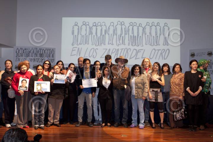 MÉXICO, D.F., 21FEBRERO2012.- Los actores Ilse Salas, Gael Garcia Bernal, Daniel Gimenez Cacho, Laure Imperiale, Sophie Alexander y Lucia Gaja con algunas de las victimas de la violencia durante la conferencia de prensa en donde se realizo la entrega simbólica del donativo recaudado en el lanzamiento de “En los Zapatos del Otro” que se realizo en el Museo Memoria y Tolerancia. FOTO: RODOLFO ANGULO /CUARTOSCURO.COM
