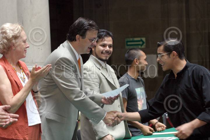 MEXICO, D.F., 03JUNIO2005.- Asa Cristina Laurell, secretaría de Salud, Marcelo Ebrard, secretario de Desarrollo Social, entregaron reconocimientos a niños rehabilitados con problemas de adicción y alcoholismo por lo Programa de Atención a Jovénes en Situación de Riesgo, durante una ceremonia en el Palacio del Ayuntamiento. FOTO: Moisés Pablo/CUARTOSCURO.COM