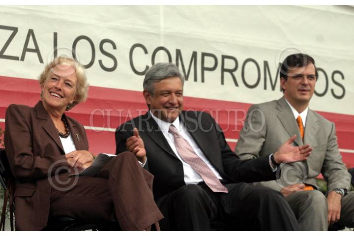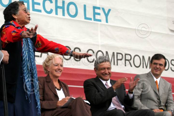 MEXICO, D.F. 26JULIO2005.- Asa Cristina Laurell, secretaria de Salud del DF, Andrés Manuel López Obrador, jefe de Gobierno capitalino, y Marcelo Ebrard, secretario de Desarrollo Social, durante la intervención de un miembro de los adultos mayores que recibieron las tarjetas de pensiones. Evento realizado en la plancha del zócalo. FOTO: Sandra Perdomo/CUARTOSCURO.COM