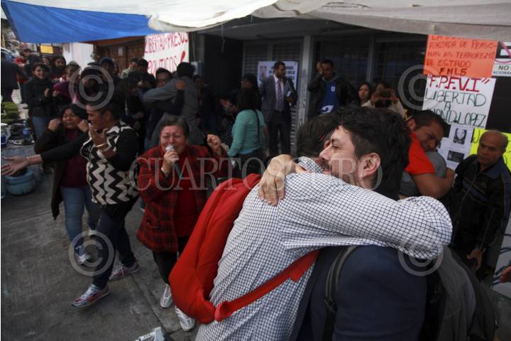 XALAPA, VERACRUZ, 29NOVIEMBRE2014.- Familiares y amigos de los 11 detenidos el pasado 20 de Noviembre en la Ciudad de México festejan el dictamen de libertad para los involucrados. Al juzgado 17 del Poder Judicial de la Federación arribaron los diputados chilenos Daniel Núñez y Jorge Insunza, así como del embajador de Chile en México, Ricardo Núñez, quienes acompañaron a Alberto Maxwell, padre del estudiante Laurence Maxwell. FOTO: FÉLIX MÁRQUEZ /CUARTOSCURO.COM