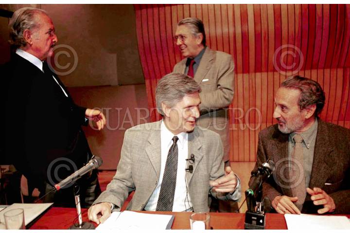 Los escritores Carlos Fuentes, Alejandro Rossi, Mario Lavista y Vicente Rojo participan en la conferencia "Proceso Creativo" en el Colegio Nacional. FOTO: Victoria Valtierra/CUARTOSCURO.COM