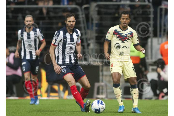 MONTERREY, NUEVO LEÓN, 22FEBRERO2020.- José Basanta del equipo de los Rayados del Monterrey se diputa el balón con Giovani Dos Santos del equipo de las Águilas del América ,en el estadio BBVA Bancomer, partido correspondiente a la jornada 7 de la Liga MX, Clausura 2020. Marcador Final: Monterrey: 0 - América: 1 FOTO: GABRIELA PÉREZ MONTIEL /CUARTOSCURO.COM
