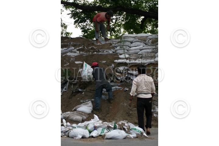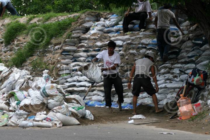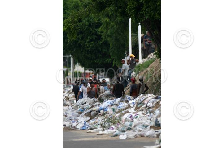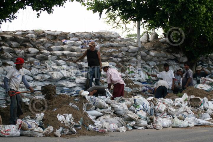 VILLAHERMOSA, TABASCO, 12JUNIO2008.- Varias decenas de obreros en su mayoría oriundos de Chiapas trabajan fuertemente en retirar las largas hileras de costales con arena sobre el malecón Leandro Rovirosa Wade. FOTO: MARCO POLO GUZMÁN HERNÁNDEZ/CUARTOSCURO.COM