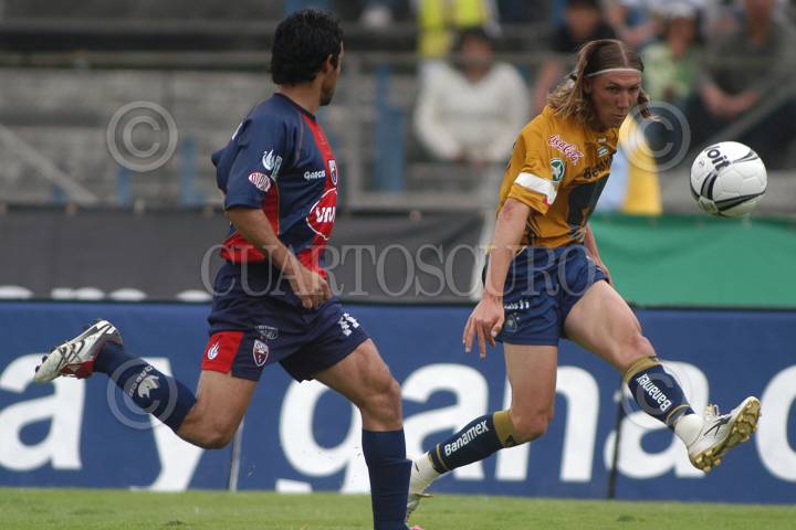 MÉXICO, D.F., 23MARZO2008.- Matias Vuoso disputando el balón con Leandro Augusto, en el partido Pumas vs Santos en el estadio olímpico universitario tras un empate a un gol. FOTO: HERMES QUETZALCOATL/CUARTOSCURO.COM