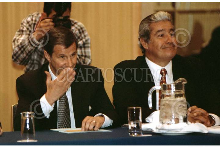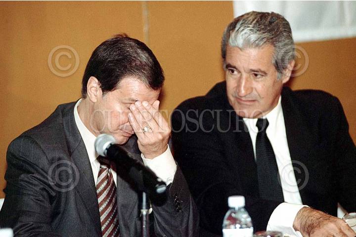 Enrique Borja y Rafael Lebrija durante la asamblea de presidentes para determinar la renuncia de Borja como presidente de la FEMEXFUT.