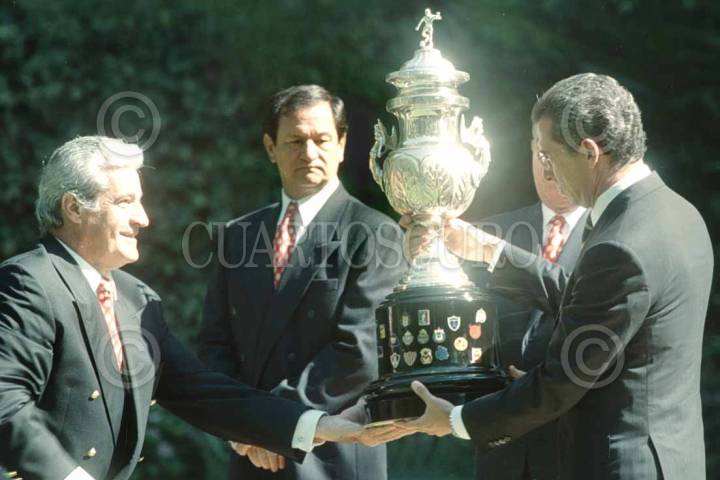 Rafael Lebrija, Enrique Meza y Ernesto Zedillo contemplan el trofeo del campeón Toluca durante la visita del equipo a la residencia oficial de Los Pinos.