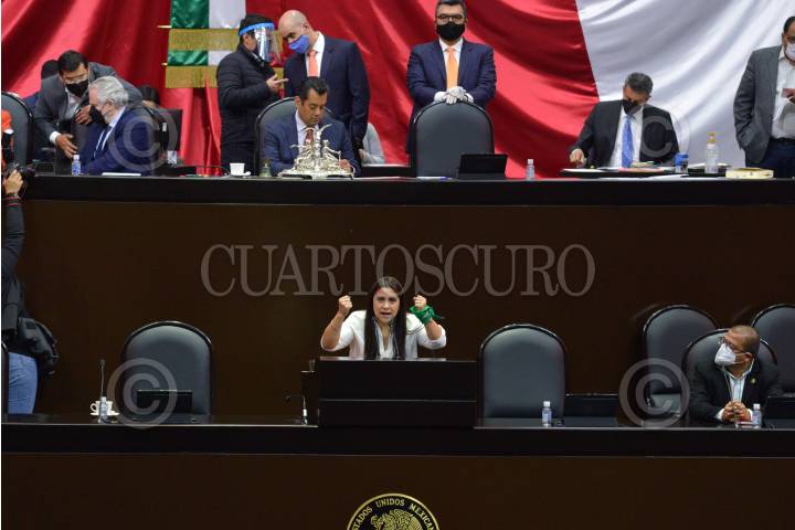 Jessica Ortega De la Cruz, diputada de MC, y compañeros de su bancada, durante su participación en la sesión solemne de la Cámara de Diputados con motivo del Día Internacional del la eliminación de la violencia contra la mujer.