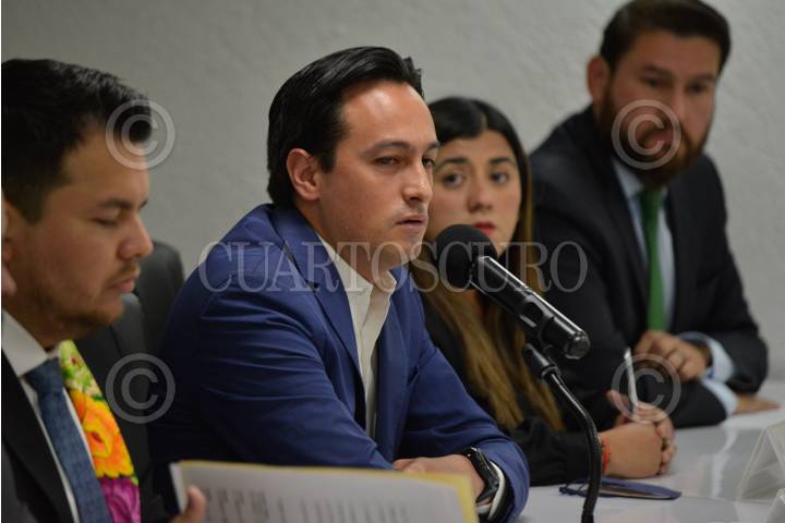 Andrés Atayde Rubiolo, presidente del PAN en la capital, durante conferencia de prensa en la que solicitaron al grupo parlamentario de Morena ofrezca disculpas por los presuntos señalamientos que hizo al legislador Raúl Torres llamándole falso mexicano.