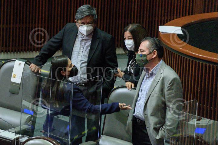 Verónica Juárez Piña, diputada y coordinadora del PRD, conversa con sus compañeros de bancada: Antonio Ortega Martínez y Leticia a Martínez Gómez, durante el debate ante el pleno la resolución emitida por el Consejo General del Instituto Nacional Electoral (INE) para modificar las reglas de asignaciones de diputaciones plurinominales.
