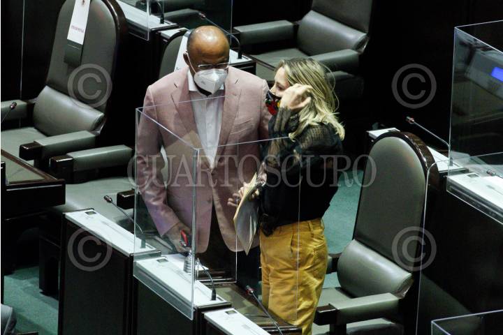 René Juárez Cisneros, diputado y coordinador del PRI, platica con su compañera de bancada Claudia Pastor Badillo, durante la sesión ordinaria de la Cámara de Diputados.