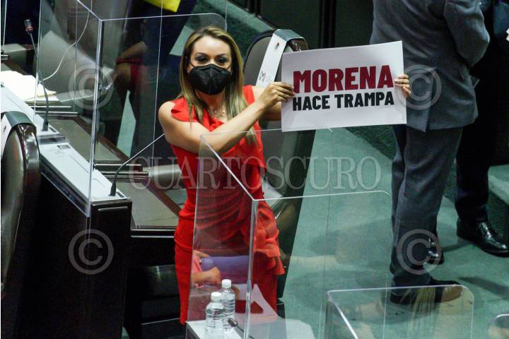 Ruth Salinas Reyes, diputada de Movimiento Ciudadano, muestra una cartulina durante el debate sobre la resolución emitida por el Consejo General del Instituto Nacional Electoral (INE) para modificar las reglas de asignaciones de diputaciones plurinominales.
