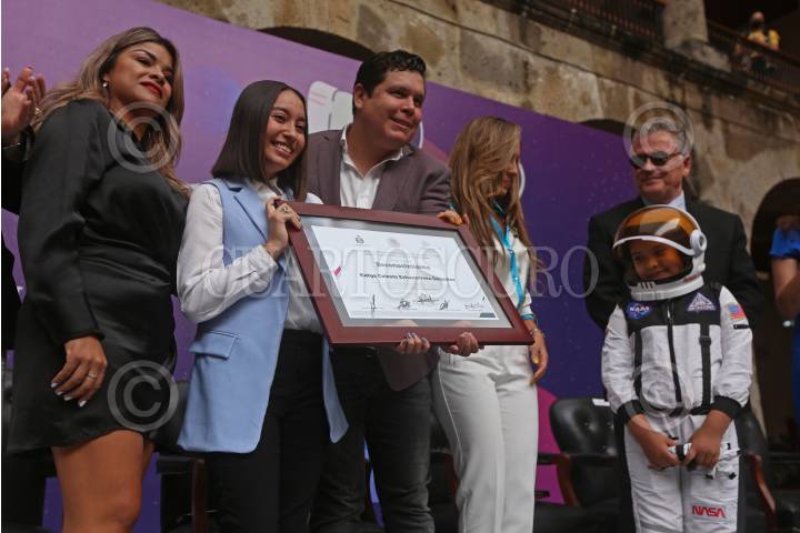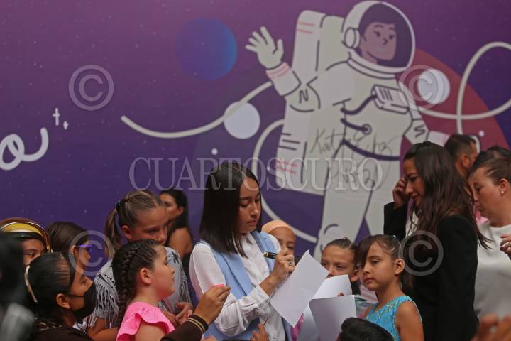 Katya Echazarreta González, da autógrafos a los pequeños que asistieron al evento, esto después de recibir un reconocimiento en el Congreso del Estado de Jalisco, por su labor en la NASA.