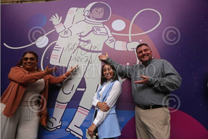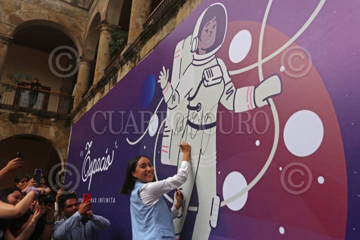 Katya Echazarreta González, autografía un astronauta de la decoración del evento, después de recibir un reconocimiento en el Congreso del Estado de Jalisco, por su labor en la NASA.