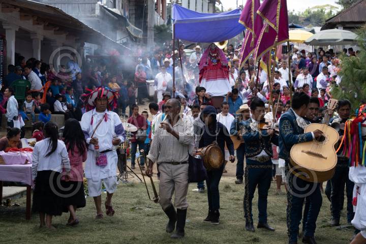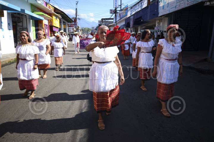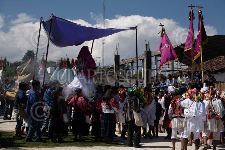 Autoridades de la comunidad y pobladores de Aldama acompañan a Santa Magdalena durante su recorrido por la cabecera municipal durante la celebración del Cuarto Viernes de Cuaresma.